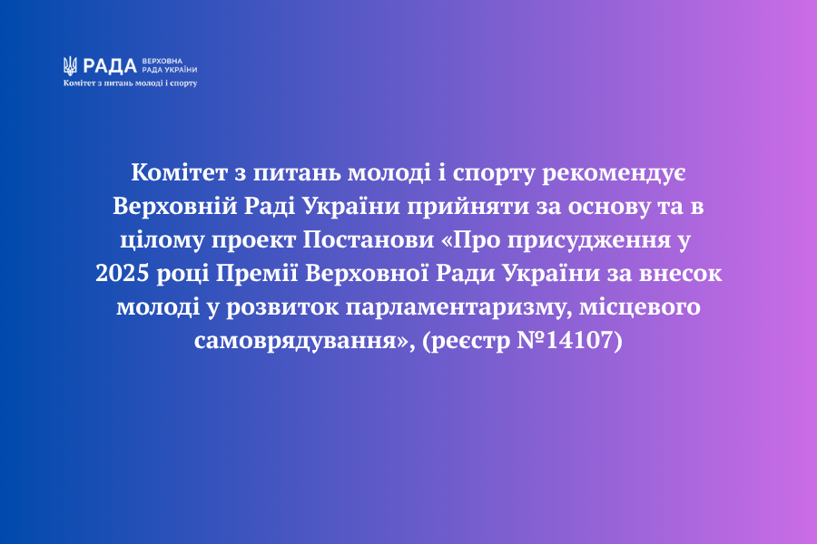 Комітет ухвалив рішення рекомендувати Верховній Раді України прийняти відповідну Постанову «Про присудження у 2025 році Премії Верховної Ради України за внесок молоді у розвиток парламентаризму, місцевого самоврядування» — за основу та в цілому.